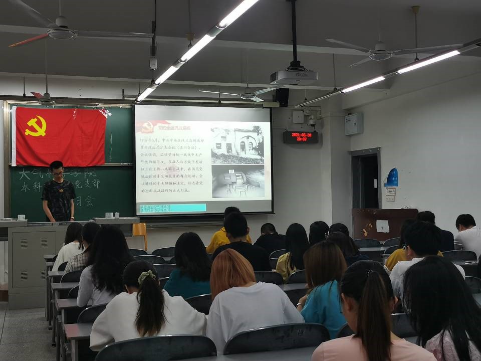 为庆祝中国共产党成立100周年,尹欣书记带领大气科学院本科生第二党支部全体党员深入学习中共党史。会议主要分为四个部分,首先介绍此次会议目的为庆祝中国共产党百年华诞的重大时刻,让党员在学习党史中牢记初心使命,然后开展题为“中国共产党——全民族抗日战争的中流砥柱”主题演讲,而后集体观看了抗日战争的相关视频,会议最后进行了本次党史学习教育会的活动总结。