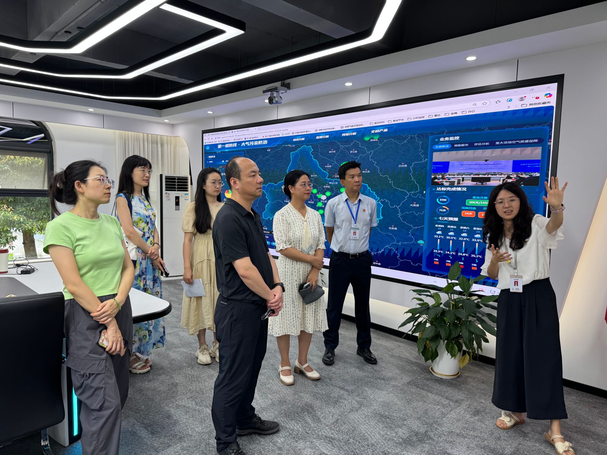 会前,温江区气象局详细介绍了温江区气象局整体规划布局、“12345”工作法、“3+6”现代化产业体系建设、全国一流气象公益综合园区与文化建设、农业气象试验田、综合气象观测体系、监测预报预警服务体系等业务平台和智慧服务系统。